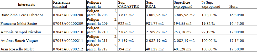 L'acte es durà a terme el dia, hora i al lloc assenyalat. En l'Annex adjunt s'especifica la relació de béns afectats i l'hora assignada per a cada interessat.