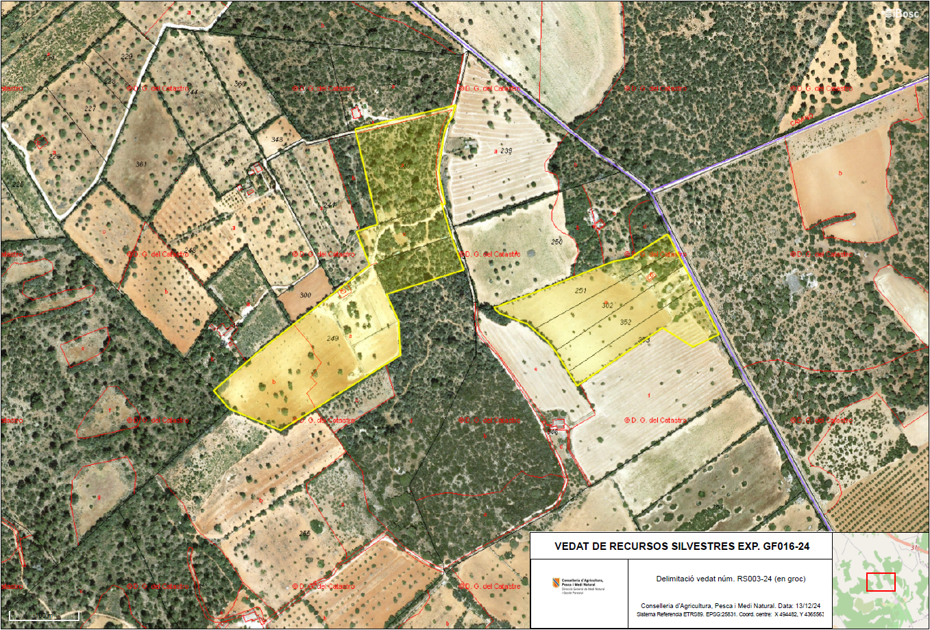 3. Dia 12 de desembre de 2024 va tenir entrada a la Conselleria d'Agricultura, Pesca i Medi Natural, sol·licitud del Sr. Joan Ferretjans Gual, en la que exposa que durant la tramitació de l'expedient s'ha creat una nova parcel·la cadastral a la zona (núm. 362, abans integrada dins la 249), i concreta que les parcel·les per a les que sol·licita la declaració de vedat són les següents, totes dins el polígon 23 de Llucmajor: 240, 249, 362, 251, 302, 352 i 353.