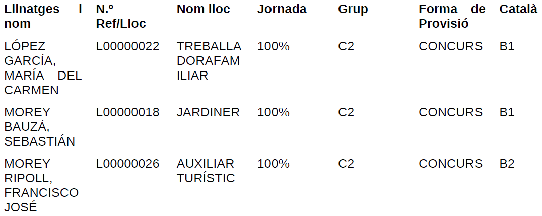En data 29 de novembre de 2024 per resolució del conseller executiu d'Hisenda i Funció Pública s'aprova la llista definitiva de persones aspirants que han superat el procés selectiu pel sistema excepcional de concurs de mèrits per a l'ingrés com a personal laboral fix del subgrup C2 de l'Ajuntament de Valldemossa, amb assignació de llocs de feina per torns d'accés per a la seva contractació com a personal laboral fix.