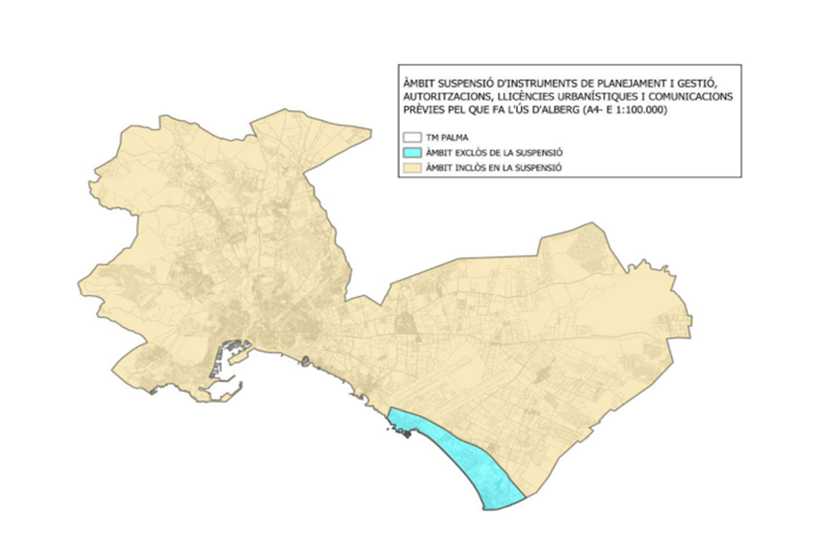 “Suspendre, amb la finalitat d'estudiar-ne una modificació del planejament vigent, i amb la durada d'un any, o fins a l' aprovació inicial de l' instrument de planejament, la tramitació i l'aprovació de plans de desenvolupament, d'instruments de gestió, així com l'atorgament de tota classe d'autoritzacions i llicències urbanístiques, i la possibilitat de presentar comunicacions prèvies, pel que fa a l' ús d' alberg, allò en els termes establerts a l'article 51 de la Llei 12/2017, de 29 de desembre, d' urbanisme de les Illes Balears, i a l'àmbit del Terme municipal de Palma amb excepció de l' àmbit del PRI de la Platja de Palma.