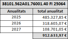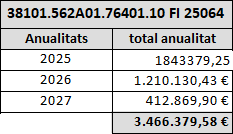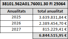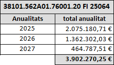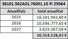 2. Autoritzar i disposar una despesa pluriennal de 45.479.927,78 € (quaranta-cinc milions quatre-cents setanta-nou mil nou-cents vint-i-set euros amb setanta-vuit cèntims) amb càrrec a les partides pressupostàries 38101.562A01.76001.10 FI 25064 per un import de 30.354.128,03 € (trenta milions tres-cents cinquanta-quatre mil cent vint-i-vuit euros amb tres cèntims), 38101.562A01.76401.10 FI 25064 per un import de 3.466.379,58 € (tres milions quatre-cents seixanta-sis mil tres-cents setanta-nou euros amb cinquanta-vuit cèntims), 38101.562A01.76001.20 FI 25064 per un import de 3.902.270,25 € (tres milions nou-cents dos mil dos-cents setanta euros amb vint-i-cinc cèntims), 38101.562A01.76001.30 FI 25064 per un import de 6.844.515,95 € (sis milions vuit-cents quaranta-quatre mil cinc-cents quinze euros amb noranta-cinc cèntims) i 38101.562A01.76001.40 FI 25064 per un import de 912.633,97 € (nou-cents dotze mil sis-cents trenta-tres euros amb noranta-set cèntims) dels pressuposts generals vigents de la CAIB o a la que aprovi el Parlament de les Illes Balears per als propers exercicis pressupostaris, distribuïdes en les anualitats següents: