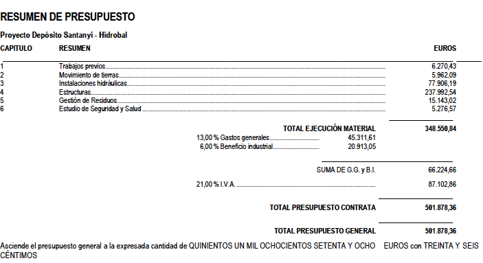 El pressupost d'execució per contracte (P.E.C.) ascendeix a la quantitat de 501.878,36 € (IVA inclòs) , que inclou 15.143,02 € per la gestió de residus.
