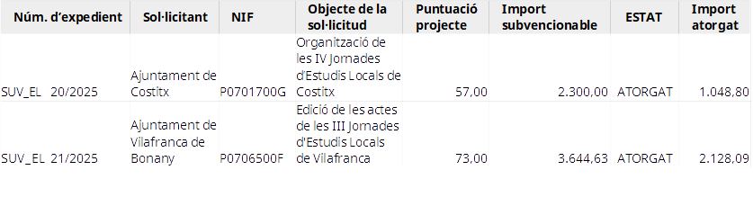 1. Mitjançant la Resolució del president de l'Institut d'Estudis Baleàrics, publicada al BOIB núm. 6, de 13 de gener de 2026, es concediren o es denegaren subvencions per donar suport a les activitats d'estudis locals que es duguin a terme a les Illes Balears durant l'any 2025.