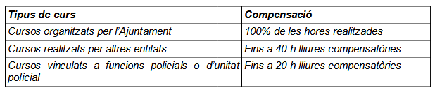 Sempre que es compleixin els requisits anteriors, l'assistència als cursos de formació proposats per l'Ajuntament es compensaran en el 100% de la seva durada en funció de l'assistència, els cursos realitzats per altres organismes, es compensaran fins a un màxim de 40 hores anuals, i els reciclatges policials realitzats per la EBAP fins a 20 hores anuals. En aquest apartat s'inclouen els cursos a distància o en línia.