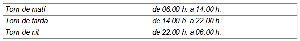 S'estableixen aquests tres torns de treball de 8 hores, amb el següent horari: