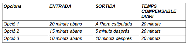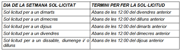 El termini de sol·licitud de compensació anticipada, serà d'un mínim de 2 dies hàbils d'antelació, i es fixa el límit de petició a les 12.00 hores del dia que correspongui.