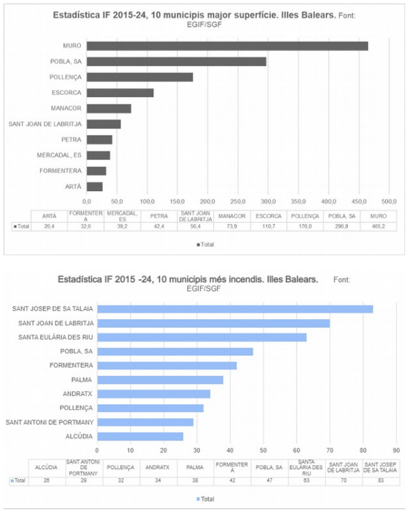 FIGURA 2.1.1.f). Comparativa per municipis (els 10 primers) en la sèrie 2015-2024 pel que fa a nombre de sinistres i superfície afectada (ha) acumulada durant els 10 anys