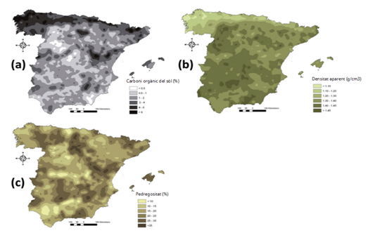 Figura 3. Valores de referencia de carbono orgánico (%), pedregosidad y densidad aparente de España. Fuente: Rodríguez Martín et al. (2016).