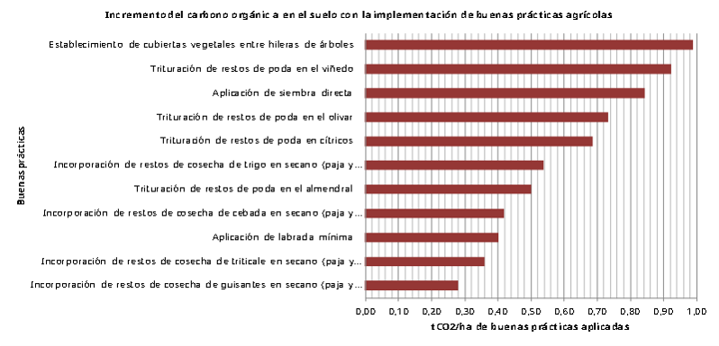 Tabla 2. Incremento del carbono orgánico al suelo con la implementación de buenas prácticas agrícolas. Fuente: Aelaboración propia, BYPCC (2006), CLey 3/2019, DMAPAMA (2018), EMITECO (2014) y FRequejo et al. (2014).