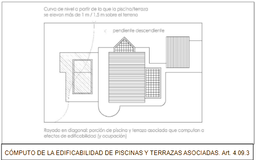 Aquellas terrazas que se construyan asociadas a las piscinas, que excepcionalmente se levanten más de un metro cincuenta (1,50 m) o un metro (1 m), en función de la pendiente, por encima del terreno de referencia o modificado, computarán a efectos de edificabilidad únicamente en la porción que se exceda del mencionado desnivel.