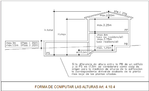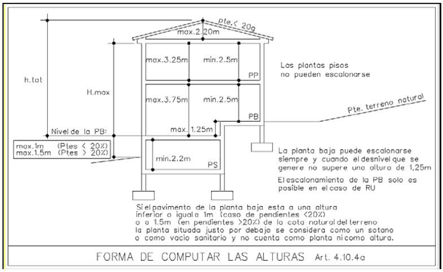 El artículo 4.10 del Volumen I de la Normativa del Plan General regula la forma de computar las alturas. En los apartados 4 y 9 del mismo artículo se regula la implantación de la planta baja y el terreno de referencia. Dado que estos apartados tienen suficiente entidad, y dado que es confuso que la implantación de la planta baja quede regulada dentro del artículo que trata de las alturas de la edificación, se propone extraerlos a un nuevo artículo 4.10 bis.