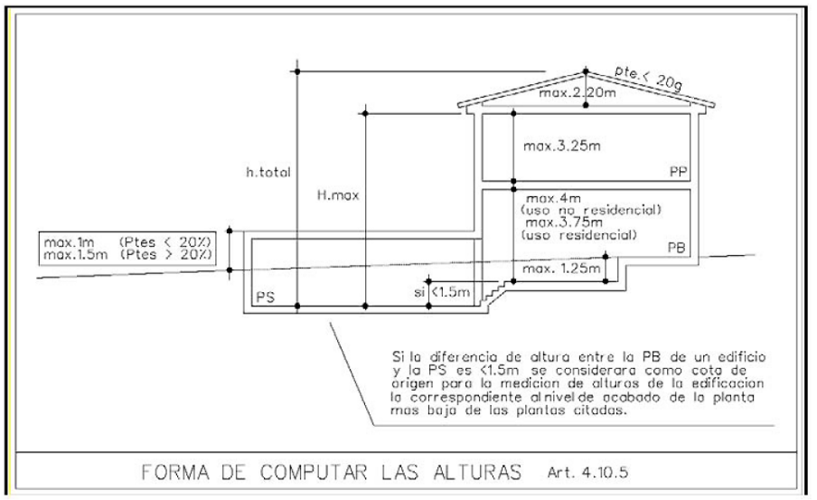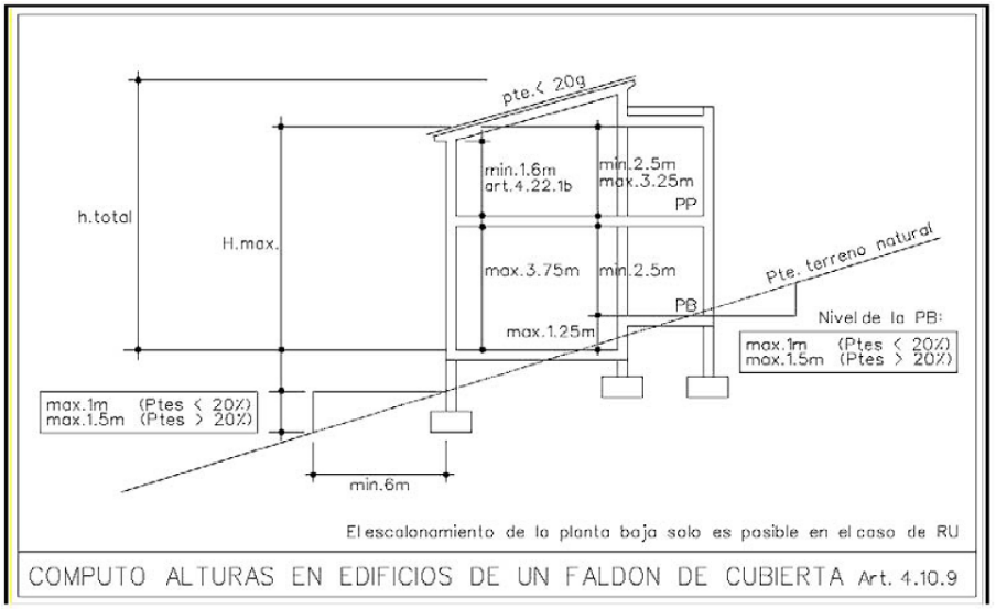 a) Con carácter general, un metro (1,00m) en terrenos con pendientes inferiores al veinte por ciento (20%) de inclinación y un metro y cincuenta centímetros (1,50m) en terrenos con pendientes superiores al veinte por ciento (20%). Este porcentaje se calculará sobre la pendiente máxima referida al terreno ocupado por la proyección de cada edificio y terrazas adyacentes. La altura máxima con respecto al terreno natural de las plataformas de terrazas, bancales y piscinas situadas sobre el espacio libre de la parcela, regirán por el mismo criterio.