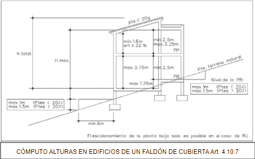 3. Se entiende por altura total (h), la distancia vertical entre la cara superior del forjado más bajo terminado de la planta baja y el remate superior del cuerpo más elevado del edificio. La diferencia entre la altura máxima y la total tiene por objeto alojar los faldones de cubierta y demás construcciones volumétricas que las Normas permiten situar por encima de la altura máxima.