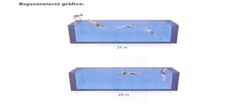 Desarrollo global del individuo en el medio acuático. Se mide la capacidad aeróbica con el desplazamiento o traslación corporal en el medio acuático, la fuerza explosiva (salida), la fuerza rápida (en los giros), la velocidad de reacción (salida), la velocidad cíclica (que es la capacidad de realizar movimientos cíclicos, iguales y repetitivos) a la máxima velocidad contra poca resistencia, velocidad gestual en la salida i los giros.
