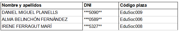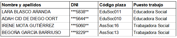 PRIMERO. Nombrar a las siguientes personas funcionarios/as de carrera, como Educadores/as Sociales, escala de administración especial, subescala técnica, clase media, grupo de clasificación A2, de la plantilla de funcionarios de este Ayuntamiento para cubrir el puesto de trabajo de Educador/a Social, con efectos del día de la toma de posesión: