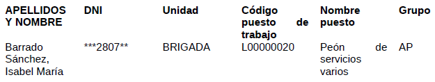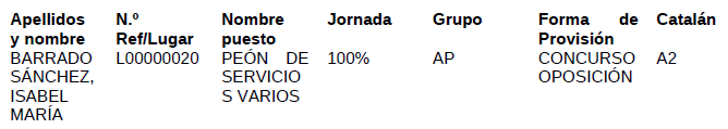 Segundo. - ADJUDICAR y ADSCRIBIR DE FORMA DEFINITIVA en el puesto de trabajo correspondiente a peón de servicios varios, a la persona que ha superado el proceso selectivo de estabilización por el sistema de concurso excepcional: