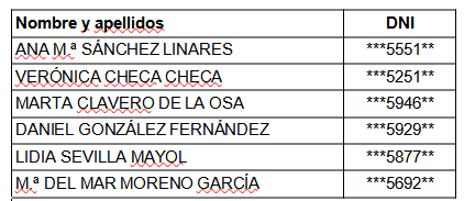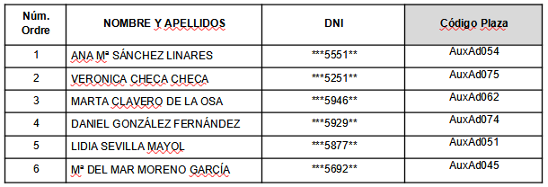 PRIMERO. Nombrar a las siguientes personas funcionarios/as de carrera, como Auxiliar Administrativo/a, escala de Administración general, subescala auxiliar, clase auxiliar, grupo de clasificación C2, de la plantilla de funcionarios de este Ayuntamiento para cubrir el puesto de trabajo de Auxiliar Administrativo/a, con efectos del día de la toma de posesión: