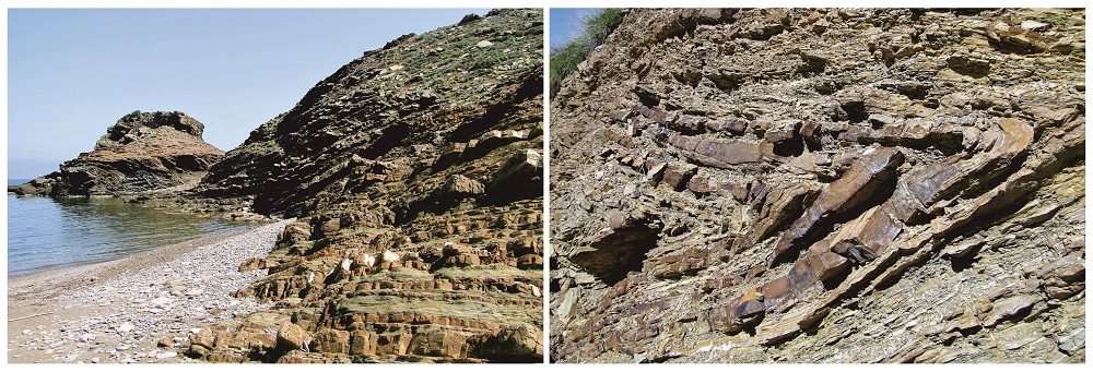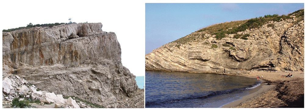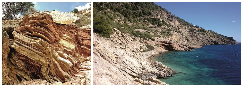 Strata of the Lower Miocene folded by the Alpine Orogeny in Cala Bóquer (left), and materials of the Upper Miocene containing a part of the old coral barriers in La Mola of Formentera (right).