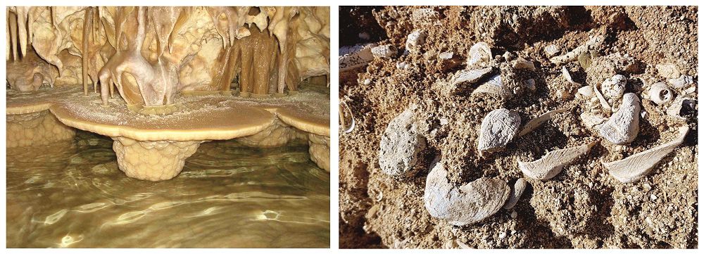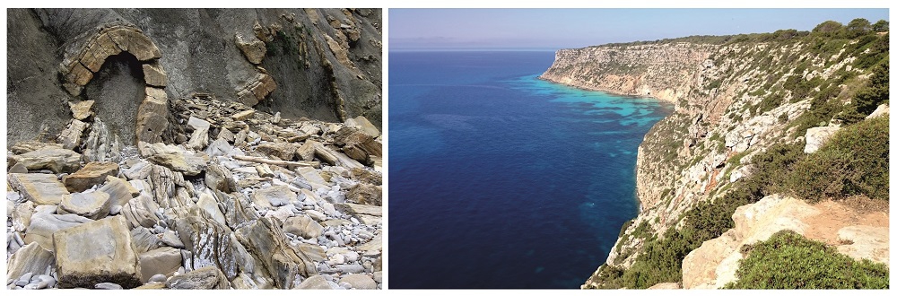 Representative geology of the Balearic Quaternary: cave Es Pas de Vallgornera (left) and fossil beach of Es Carnatge (right).