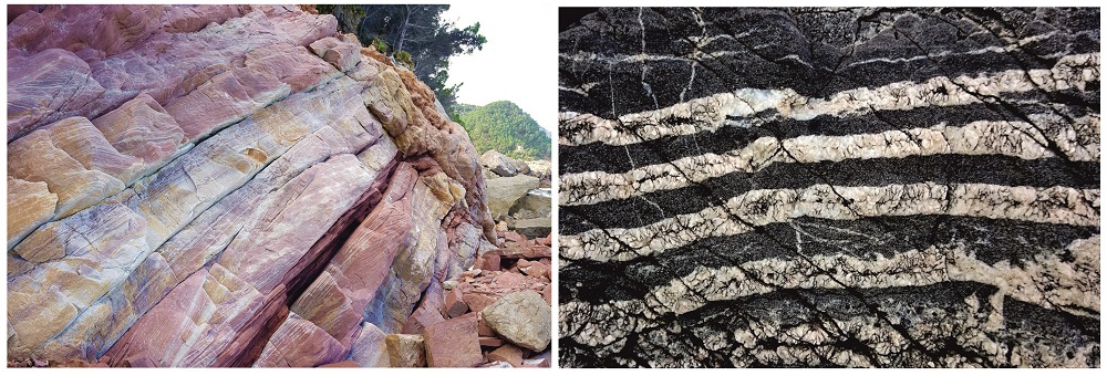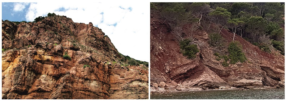 Two types of representative rocks of the Balearic Triassic: red sandstones of Estellencs (left) and veined dolomites of Punta d’en Valls (right).