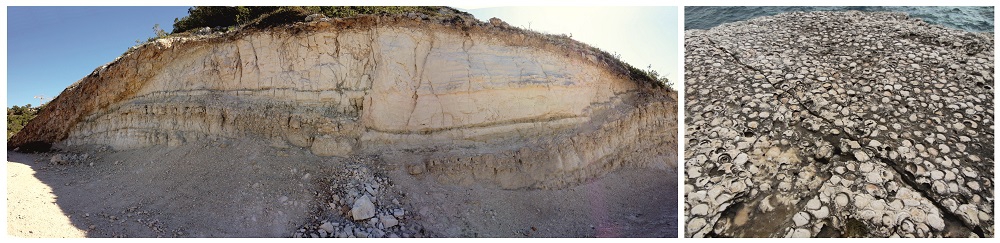 Outcrop from the epoch of the Messinian Salinity Crisis in the zone of Puig de Ros (left) and lumaquela (right) on the Pliocene beaches of the Cala Pi-Vallgornera zone.
