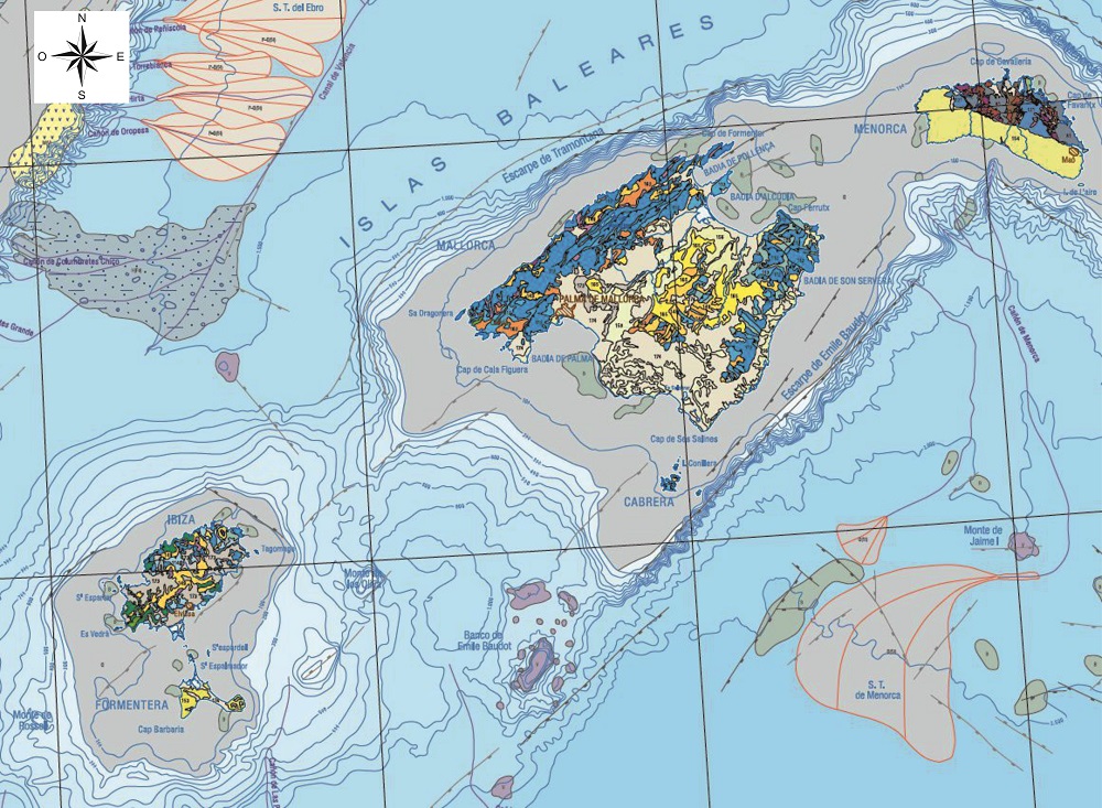 Geology of the Balearic Islands. The brown and dark grey colours are Paleozoic materials, the blues and greens are Mesozoic, the oranges and yellows are Paleogene and Neogene, and the light greys are Quaternary (IGME, 2015)