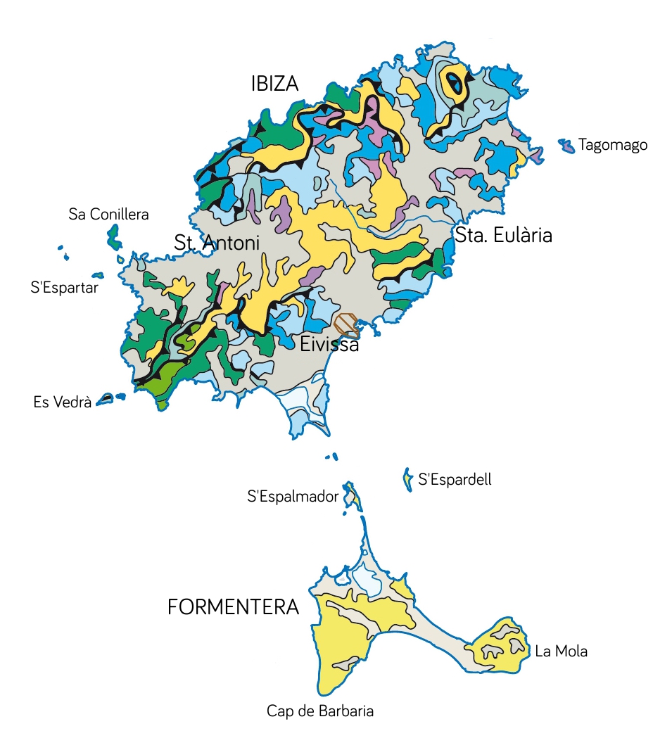 Geological map of Eivissa and Formentera: purple represents Triassic materials, blue are Jurassic, green colour are Cretaceus, yellow Neogene and grey are Quaternary deposits.