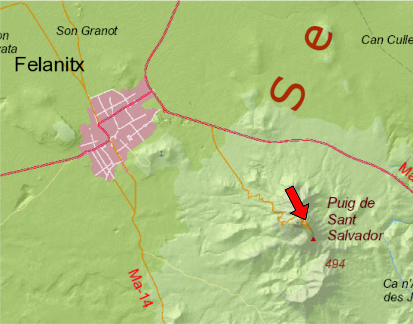 Leaving the town of Felanitx in the direction of Portocolom on the Ma-4010 road, take the path to the Puig de Sant Salvador located on the right-hand side some 800 metres after the exit from the town.