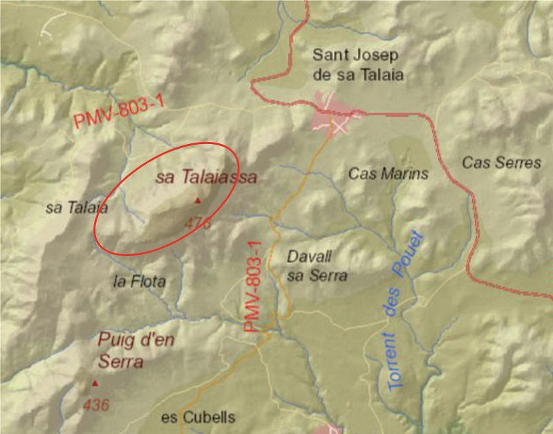 From the PM-803-1 road, take the second exit of the first roundabout in the direction of Cala d’Hort. Follow the road for some 650 m until you see a turning to the left signposted “Sa Talaia”.