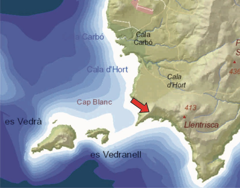 On the PMV-803-1 road from Sant Josep to Es Cubells, follow the signs to Cala d’Hort one kilometre before reaching the village. Approximately 3.6 km after the signpost, take the dirt track to the left with a pink sign for the Torre des Savinar.