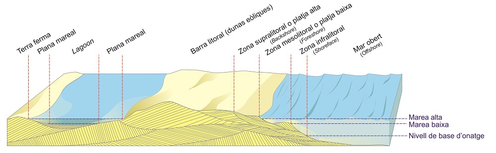 This is a beach-lagoon system displaying a distinction between a submerged maritime or infralittoral zone, a subaerial beach zone (mesolittoral and supralittoral zone, foreshore and backshore) and a dune zone.