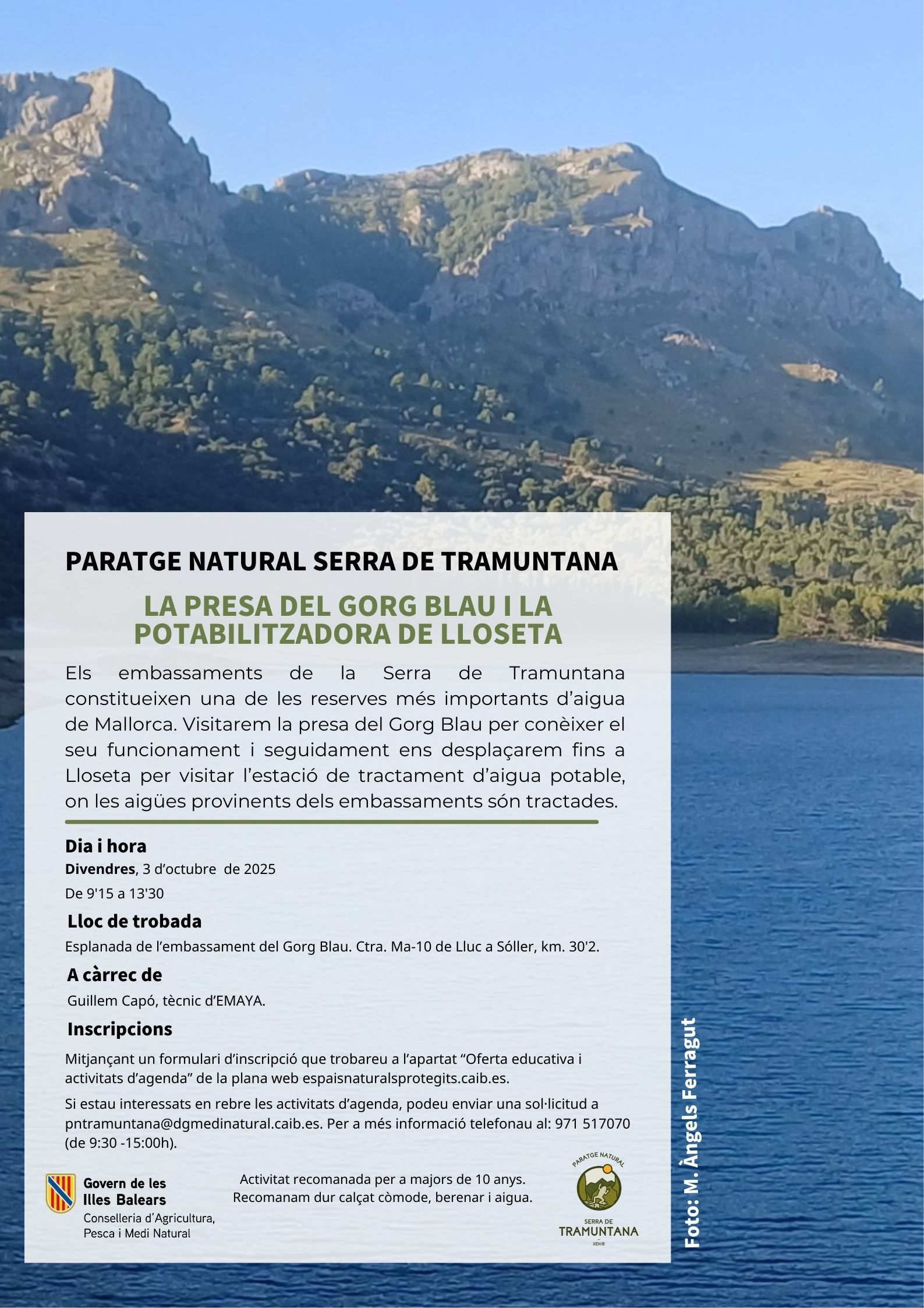 DESCRIPCIÓ: Els embassaments de la Serra de Tramuntana constitueixen una de les reserves més importants d'aigua de Mallorca. Visitarem la presa del Gorg Blau per conèixer el seu funcionament i seguidament ens desplaçarem fins a Lloseta per visitar l'estació de tractament d'aigua potable, on les aigües provinents dels embassaments són tractades.