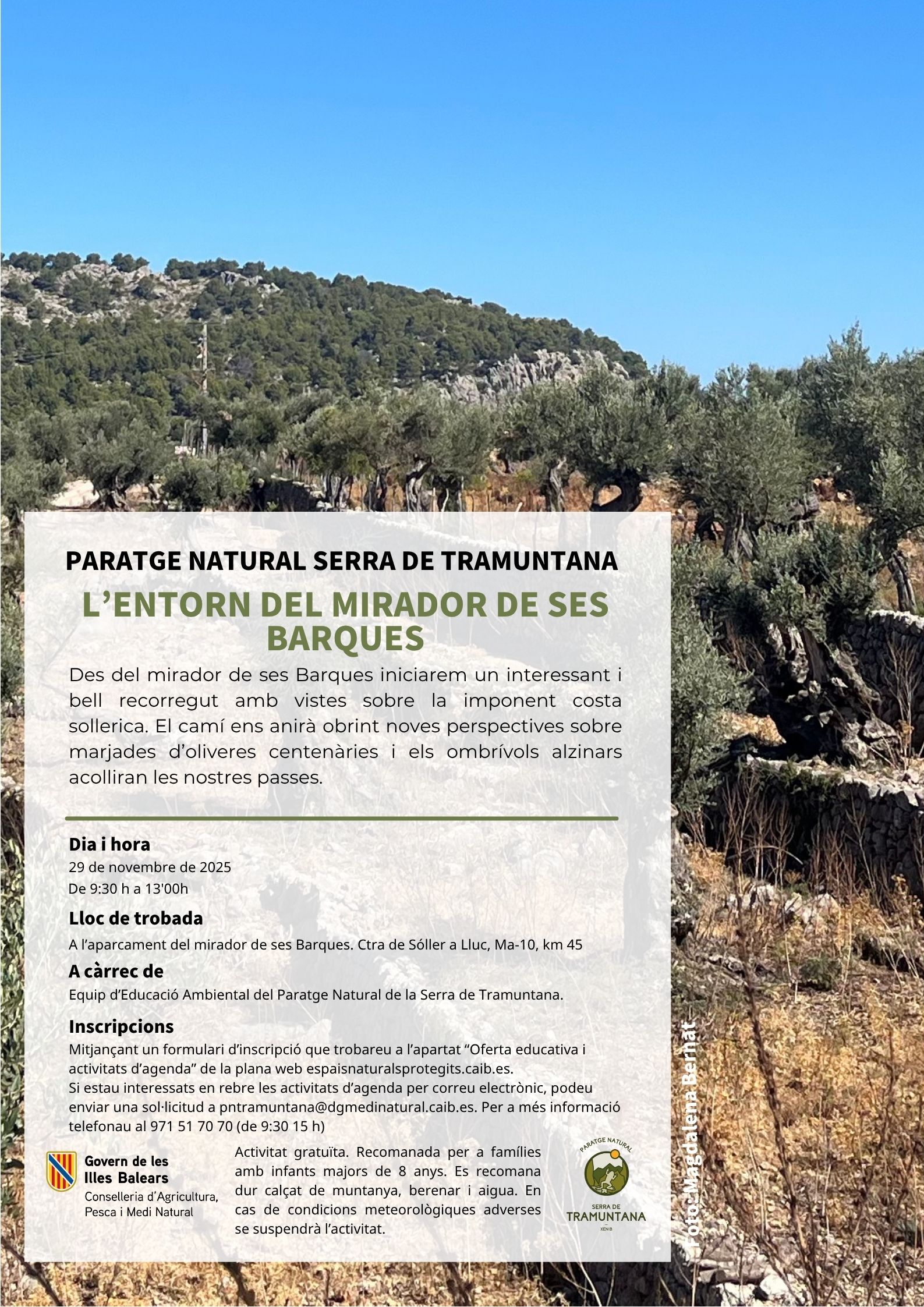 DESCRIPCIÓ: Des del mirador de ses Barques iniciarem un interessant i bell recorregut amb vistes sobre la imponent costa sollerica. El camí ens anirà obrint noves perspectives sobre marjades d'oliveres centenàries i els ombrívols alzinars acolliran les nostres passes.