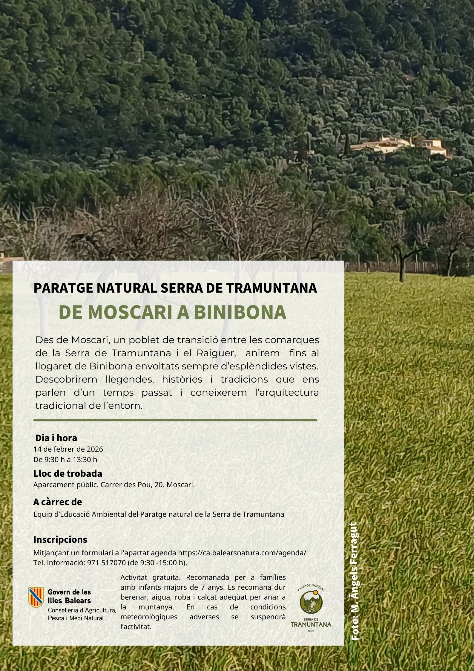 DESCRIPCIÓ: Des de Moscari, un poblet de transició entre les comarques de la Serra de Tramuntana i el Raiguer, anirem fins al llogaret de Binibona envoltats sempre d'esplèndides vistes. Descobrirem llegendes, històries i tradicions que ens parlen d'un temps passat i coneixerem l'arquitectura tradicional de l'entorn.