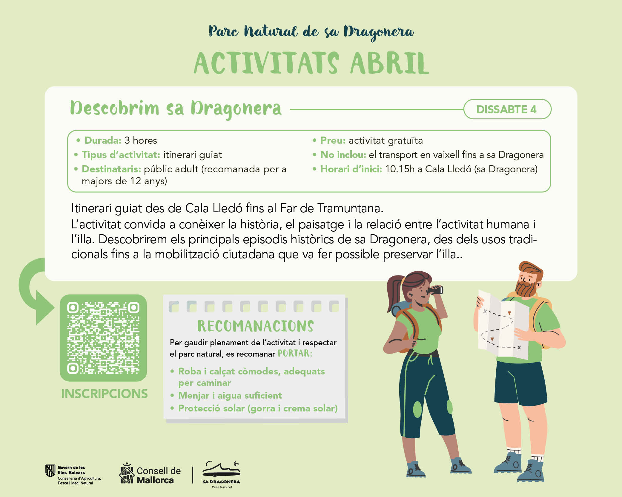 OBSERVACIONS: Activitat gratuïta, però cal inscripció prèvia. Per a públic general. A partir de 6 anys. Recordau que l'activitat no inclou el transport entre Mallorca i sa Dragonera.