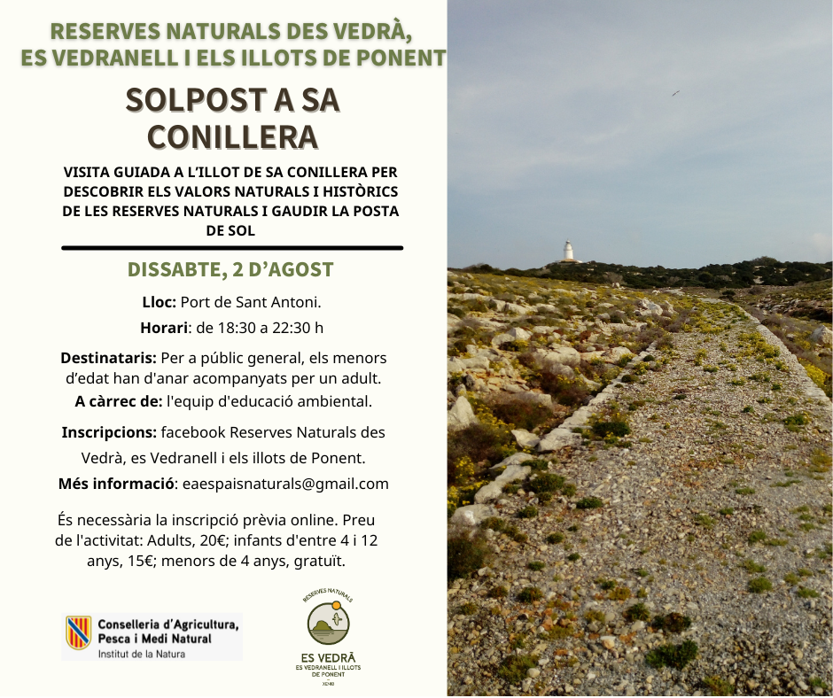 DESCRIPCIÓN: Visita guiada al islote de sa Conillera para descubrir los valores naturales y històricos de las Reservas Naturales y disfrutar la puesta de Sol.