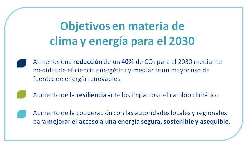 A partir del éxito del Pacto de las Alcaldías, en 2014 se lanzó la iniciativa Mayot Adapt, basada en el mismo modelo de gestión pública, mediante la que se invitaba a las ciudades a asumir compromisos políticos y tomar medidas para anticiparse a los efectos inevitables del cambio climático. A finales de 2015, con motivo de la 21 Conferencia Internacional del Cambio Climático (COP21) se creó el nuevo Pacto de las Alcaldías para el Clima y la Energía. Este nuevo pacto adopta un objetivo de reducción de CO2 superior al 40% para el año 2030, con referencia al año 2005 y junta mitigación y adaptación del cambio climático en un mismo compromiso. Además, da lugar a un pacto global, es decir, extendido a todos los continentes del mundo y no sólo en el ámbito europeo, y plantea objetivos de reducción para el año 2050.