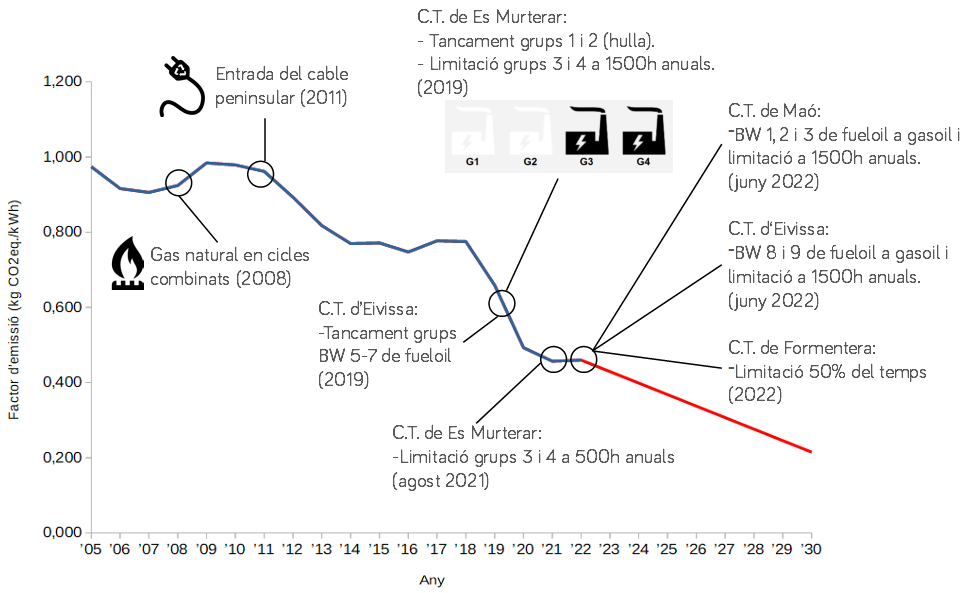 Gráfica 1. Evolución del factor de emisión del mix eléctrico balear. Fuente: elaboración propia