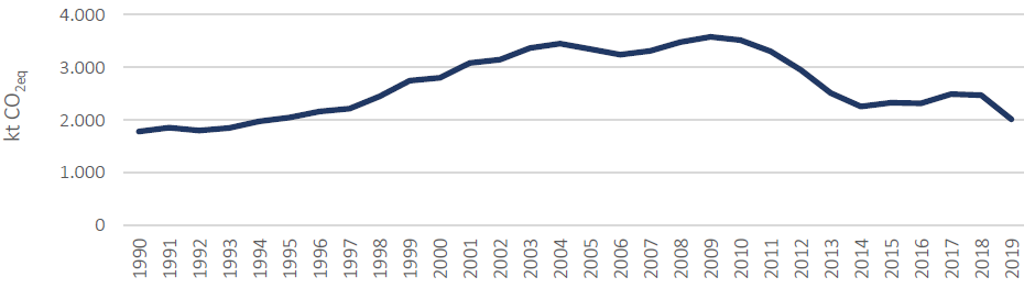 La evolución de las emisiones de este sector es muy similar a la del sector de la generación y distribución de la energía. El máximo se consigue en 2010 con 946,72 ktCO2eq. A partir de entonces, se empieza a apreciar el ya mencionado desacoplamiento entre las emisiones y los factores socioeconómicos. Después de un periodo de disminución hasta 2014, aumentan de nuevo hasta 2018 para disminuir una vez más en 2019, hasta las 615,82 ktCO2eq.