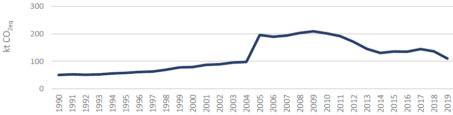 Se trata de uno de los sectores con menos emisiones, con un pico máximo de 208,75 ktCO2eq en 2009. A partir de este año sigue la tendencia general descendente hasta 2019, consiguiendo las 110,11 ktCO2eq.