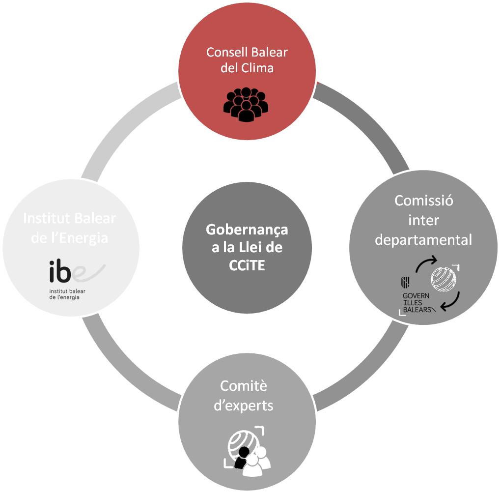 El artículo 6 de la Ley 10/2019, de 22 de febrero, de cambio climático y transición energética, crea el Consejo Balear del Clima como órgano colegiado de carácter consultivo, adscrito a la consejería competente en materia de cambio climático, que tiene como finalidades primordiales asesorar a las administraciones públicas sobre las políticas climáticas y de transición energética, proponer medidas de mitigación y adaptación al cambio climático, así como favorecer la participación de los sectores sociales y económicos de las Illes Balears en estos ámbitos.