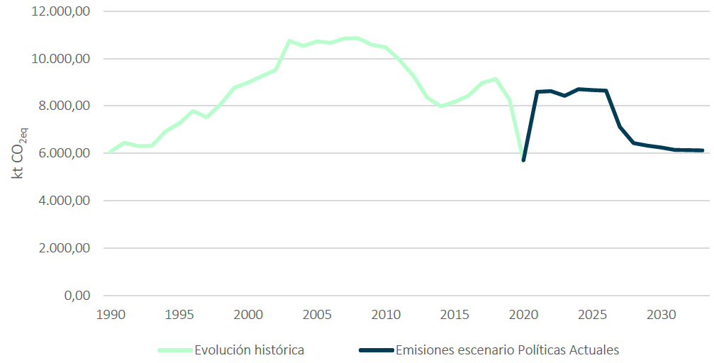 La siguiente ilustración muestra las emisiones del escenario tendencial o de Políticas Actuales. Las emisiones representadas de 1990 a 2020 son las publicadas en los inventarios de emisiones GEI del Gobierno de las Illes Balears, adaptando algunos valores a la realidad insular: