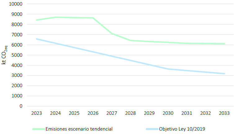 En el escenario tendencial se aprecia una disminución de las emisiones totales. El mayor causante de esta disminución es la nueva interconexión con la península prevista para el 2026-2027. La energía importada de la península aumentará, disminuyendo el uso de combustibles para generación eléctrica de alto factor de emisión en Islas Baleares. Además, esta energía importada, por el hecho que el mix de generación peninsular tiene un factor de emisión muy inferior al de la generación eléctrica en Islas Baleares, aportará menos emisiones. La mejora de la eficiencia energética y una mayor presencia de renovables también favorecen esta disminución. Sin embargo, la reducción de emisiones en este escenario no es suficiente para conseguir el objetivo de la Ley 10/2019. Respecto a 1990, las emisiones se prevén un 3% superiores.