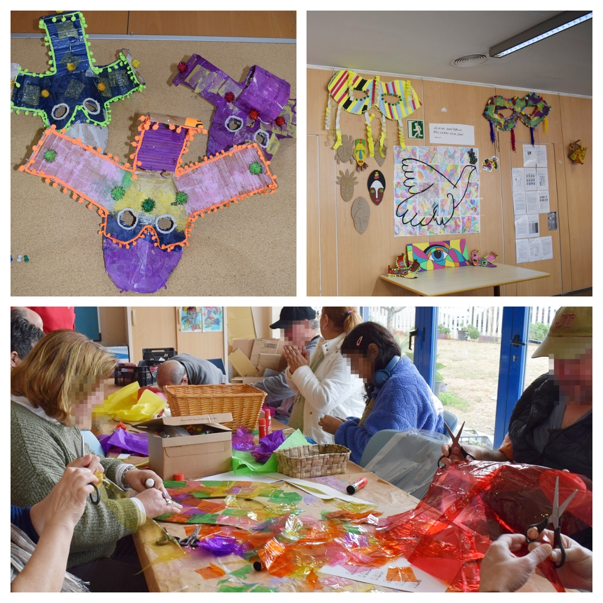 Enguany s'ha optat pel treball grupal on els usuaris i les usuàries han fet l'elecció dels companys per al seu equip i han realitzat tres grans antifaços amb diferents tècniques, a més de crear la seva pròpia màscara amb tècnica lliure i reciclar els treballs carnavalescos d'altres anys.