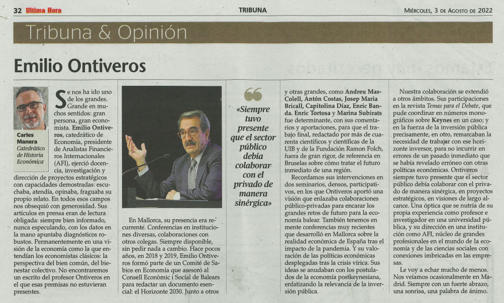 Article del diari Última Hora, secció Tribuna & Opinión, signat per Carles Manera on es menciona que Emilio Ontiveros va assessorar al CES en l'estudi Horizonte 2030: