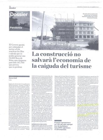 El Govern defensa que l’estímul a la construcció és una de les receptes vàlides per tornar a posar en marxa l’economia després del xoc de la pandèmia, mentre que, paral·lelament, treballa per no donar per perduda la temporada turística. “L’enfonsament de l’hostaleria té unes conseqüències econòmiques gravíssimes i una de les fórmules que s’intenta per destruir els mínims llocs de feina possible és reactivar la construcció”, va explicar divendres la consellera de Presidència i portaveu del Govern, Pilar Costa, que va citar un informe que el Consell Econòmic i Social (CES) havia publicat dies abans, en el qual s’indica que la construcció “és un dels sectors que es pot posar en marxa de manera més ràpida i és capaç de mantenir el nombre de treballadors, a més d’incorporar força de treball en situació d’atur”. El president del CES, Carles Manera, reconeix que “és molt difícil saber quina quantitat d’ocupació pot absorbir la construcció”, encara que sí que considera que “podria aixecar una part dels desocupats”. “És difícil pensar que la construcció ho assolirà tot, però era un sector que tenia una dinàmica raonable abans que el coronavirus el paralitzàs”, explica. “Està molt bé debatre sobre diversificació, però el problema és donar sortida a milers de persones sense feina”, diu.