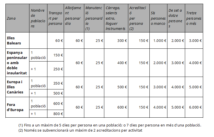 - El desplaçament i estada de persones i personal tècnic per dur a terme activitats o actuacions en directe fora de l’illa de residència.