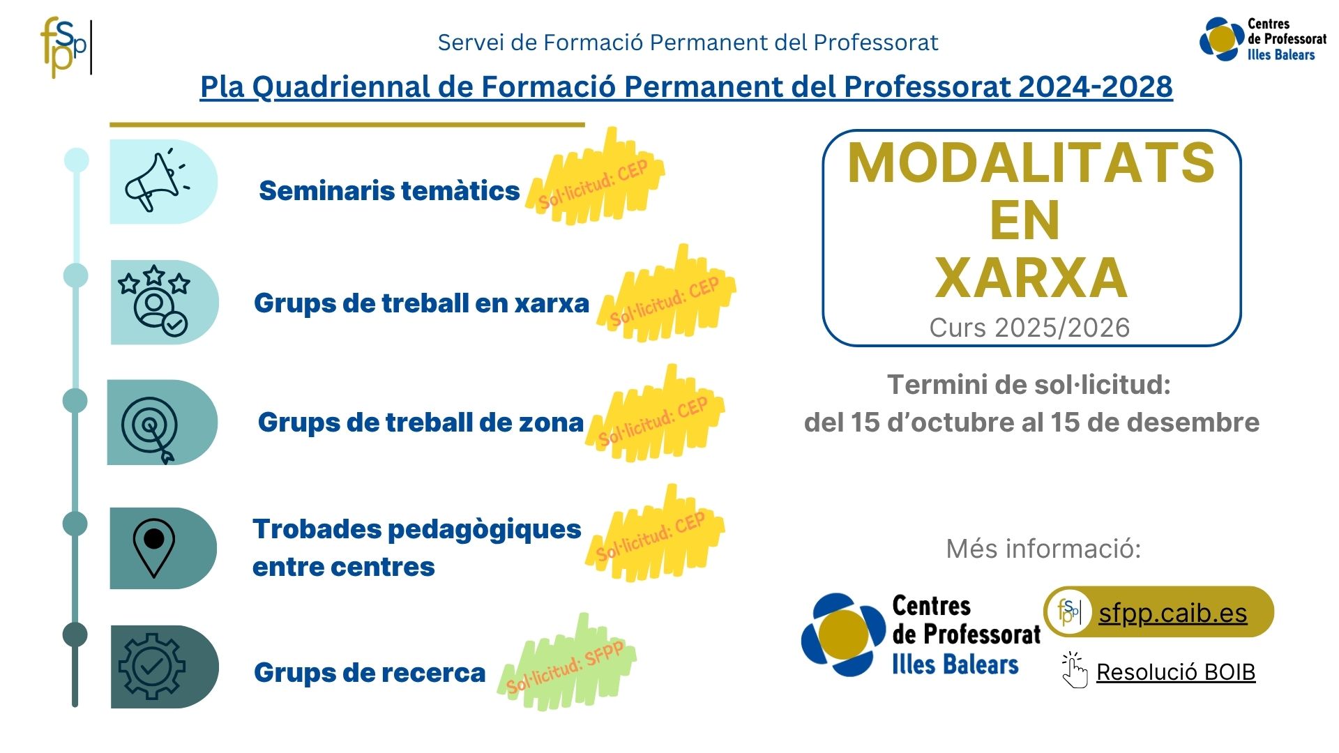 El Servei de Formació Permanent del Professorat (SFPP) publicó al inicio de este año la resolución que establece las instrucciones para la convocatoria, desarrollo y seguimiento de las modalidades formativas incluidas en el Pla Quadriennal de Formació Permanent del Professorat 2024-2028. Esta resolución define los procedimientos para solicitar seminarios temáticos, grupos de trabajo en red, grupos de trabajo de zona, grupos de investigación y encuentros pedagógicos entre centros.