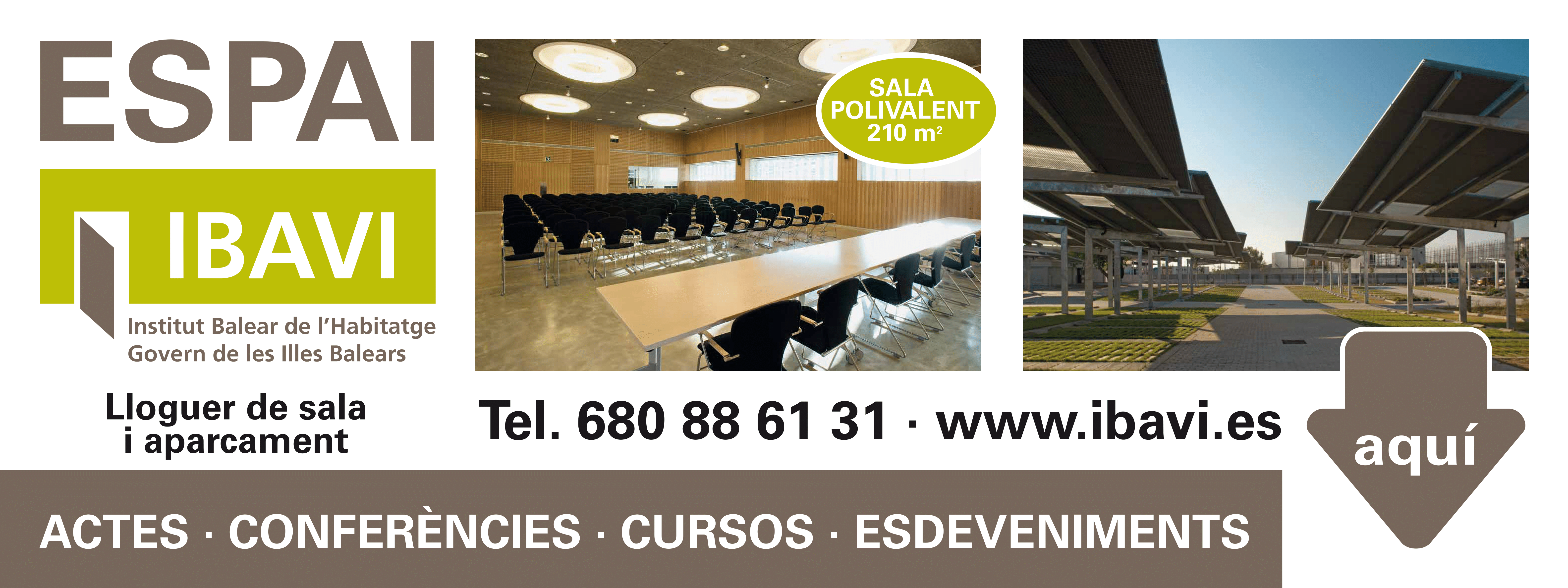 L'IBAVI torna a posar en marxa l'ESPAI IBAVI, un recinte a Palma on podreu celebrar una gran varietat d'actes i esdeveniments, com ara exposicions, cursos, conferències, reunions, congressos, ponències i molt més. L'ESPAI IBAVI consta d'una sala polivalent de 210 m2 amb una capacitat per a 235 persones i un complet equipament mobiliari que es pot distribuir d'acord amb les necessitats particulars de cada esdeveniment. També disposa d'una àrea de recepció, una oficina de treball i una cabina de control de so i projeccions que ofereixen el suport logístic i tècnic per a qualsevol ocasió. A més, per tal de facilitar l'accés dels assistents, l'ESPAI IBAVI compta amb una àmplia zona d'aparcament amb 110 places cobertes i espais destinats a l'estacionament d'autocars. Les instal·lacions, envoltades d'una zona enjardinada, estan situades a la sortida de la via de cintura, molt ben comunicades i de fàcil accés, tant des de qualsevol indret de Palma com des de l'aeroport. Podeu sol·licitar més informació al correu espaiibavi@ibavi.caib.es o al telèfon 680 88 61 31. |