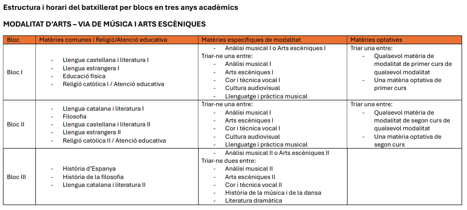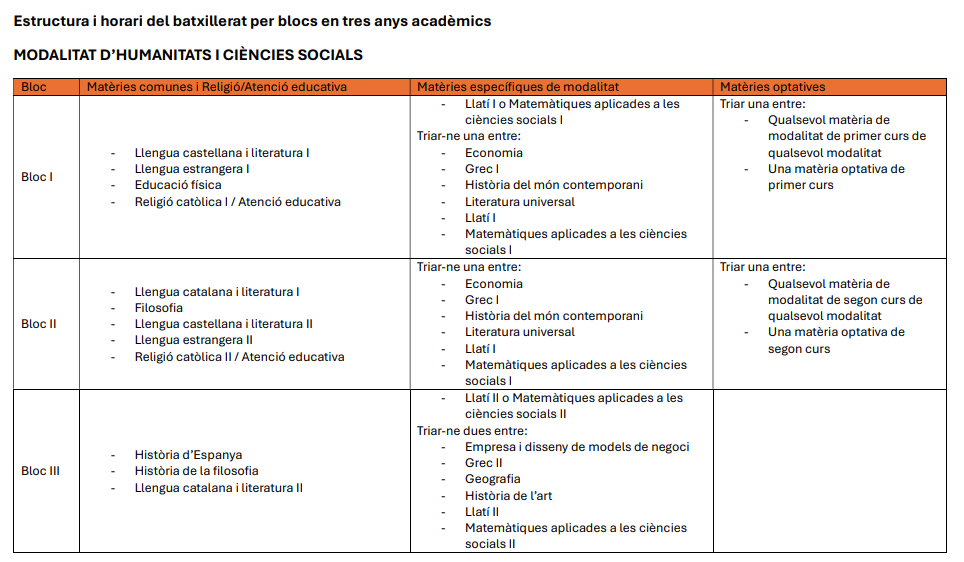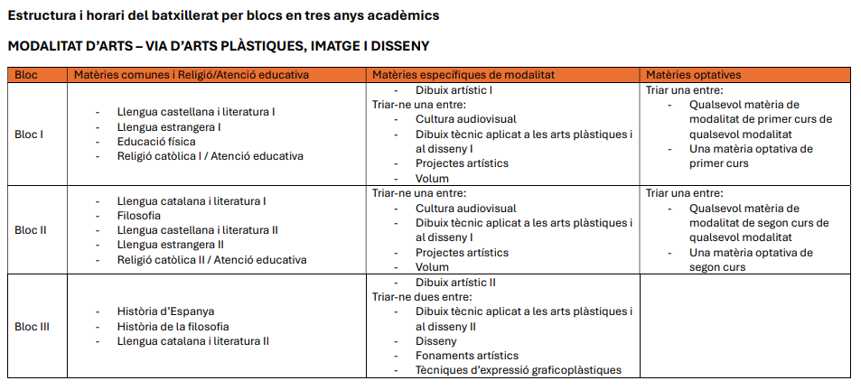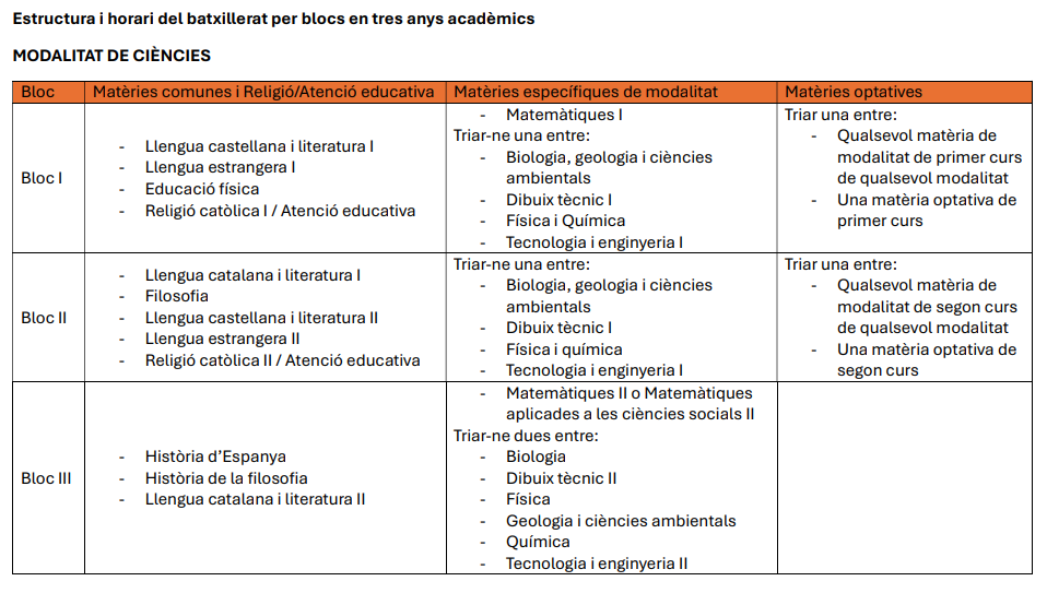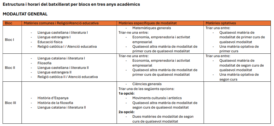 Estructura genèrica del batxillerat per blocs en tres anys acadèmics